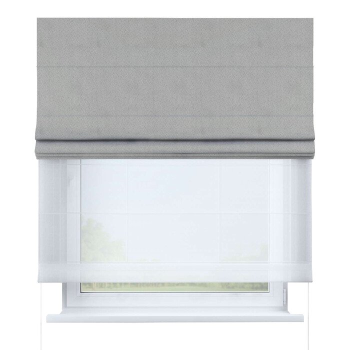 Римские шторы День-Ночь — система из двух отдельных полотен: полупрозрачный тюль для рассеянного света днем и плотная ткань (блэкаут) для затемнения ночью. Управление полотнами независимо друг от друга для максимальной регулировки освещенности и приватности.